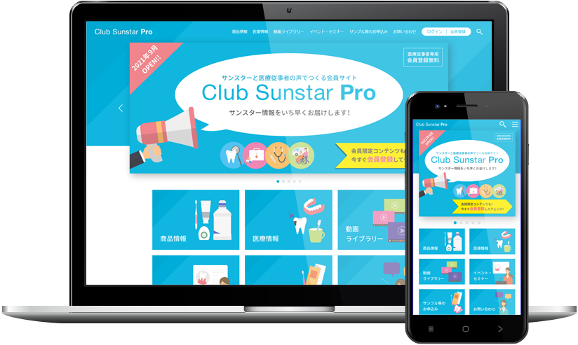 今までウェブ上に点在していた歯科・口腔ケアをはじめとした医療従事者へのサンスター発信の情報を集約。わかりやすい情報提供と忙しい医療従事者がより簡単に、求める情報にたどり着けるよう商品情報を症例やライフステージで検索できるよう設計し直したことで会員目線のサイトに再編してコンテンツを充実させ、2021年9月にオープンした。